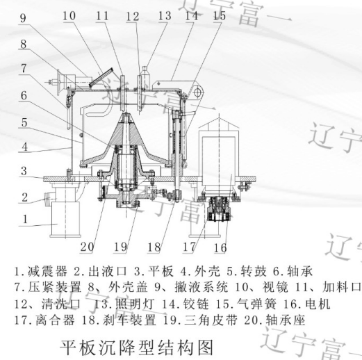 二、工作原理:電機通過傳動系統(tǒng)帶動轉(zhuǎn)鼓繞主軸軸心回轉(zhuǎn),物料從進料管進入轉(zhuǎn)鼓后,在離心力作用下,比重大的固體顆粒下沉,比重輕的液體上浮,形成環(huán)狀分層,清液可通過撇液裝置排出,固相物則在降速后由人工或機械方式卸出。