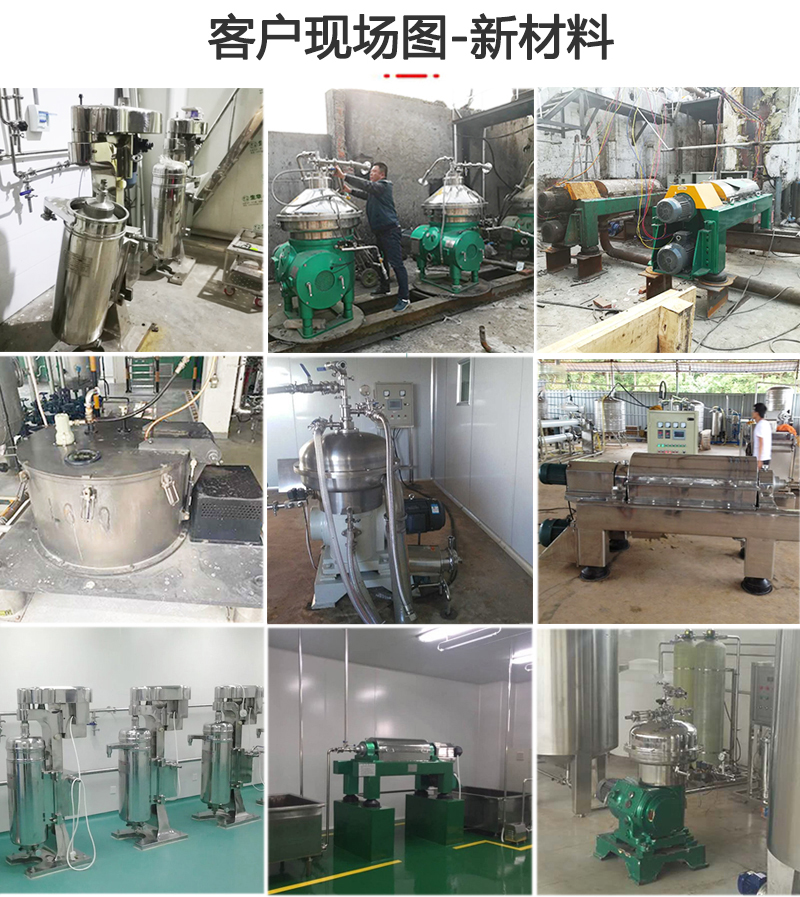 應(yīng)用設(shè)備:根據(jù)新材料生產(chǎn)工藝的不同,物料的不同參數(shù),可適用的離心機(jī)有管式離心機(jī)、碟式離心機(jī)、臥螺離心機(jī)、平板離心機(jī),其選擇依據(jù)主要有處理量、含固量、分離效果等因素。